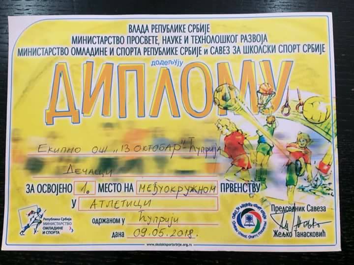 Ученици ОШ “13 ОКТОБАР” -ЋУПРИЈА освојили су ПРВО место екипно на МЕЂУОКРУЖНОМ такмичењу у атлетици и пласирали се на РЕПУБЛИЧКО такмичење, који ће се одржати 15.05.2018. у Новом Пазару. У појединачној конкуренцији прва места су освојили:
