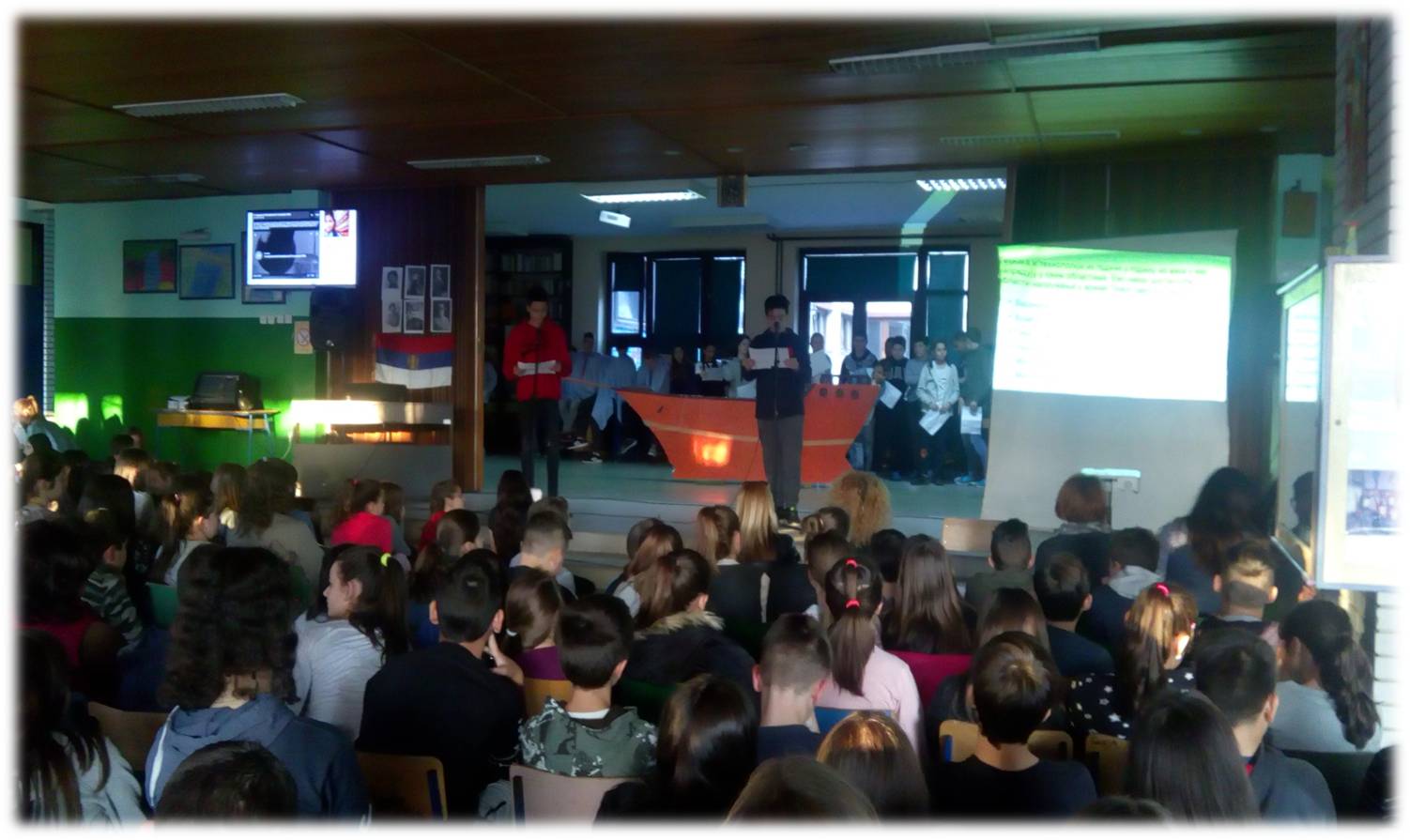 Виђење Србије у Великом рату кроз 18 припремљених активности из 12 предмета припремило је 20 наставника и око 100 ученика учесника, а великом часу присуствовало је 15 наставника и око 250 ученика. Ученици су након одслушаних активности учествовали у квизу Брзи прсти где су успели да покажу знање, да се забаве и докажу да су сви циљеви тематског дана остварени- успели смо да прикажемо виђење једног значајног догађаја кроз све предмете и остваримо сарадњу наставника и ученика који су својим истраживачким радом, залагањем и презентовањем успели да укажу на утицај Великог рата, храброст и родољубље војника који су дали животе за своју домовину, хероје и хероине, као и на положај деце, младих и жена и последице ратних разарања.
